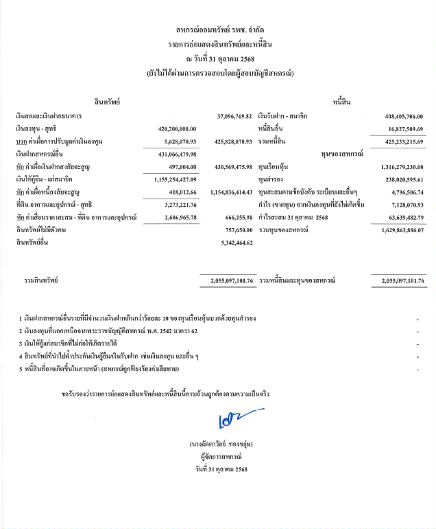 งบย่อแสดงสินทรัพย์ และหนี้สิน ณ เดือน ตุลาคม 2568